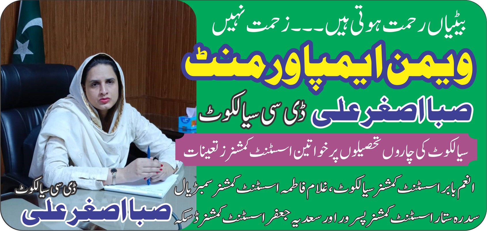 سیالکوٹ کی موجودہ ڈپٹی کمشنرصبا ءاصغر علی نہ صرف ایک قابل، باصلاحیت اور فرض شناس افسر ہیں، ان کی تعیناتی سے اس بات کو تقویت ملی ہے کہ خواتین بھی اعلیٰ سطحی انتظامی ذمہ داریاں بخوبی نبھا سکتی ہیں۔ ان کے ساتھ چاروں تحصیلوں میں بھی خواتین اسسٹنٹ کمشنرز انعم بابر اسسٹنٹ کمشنر سیالکوٹ،غلام فاطمہ اسسٹنٹ کمشنر سمبڑیال،سدرہ ستار اسسٹنٹ کمشنر پسروراور سعدیہ جعفراسسٹنٹ کمشنر ڈسکہ تعینات ہیں۔