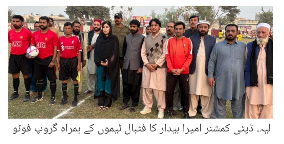 ڈپٹی کمشنر لیہ امیرا بیدار تیسرے آل ڈسٹرکٹ چیلنج کپ ڈے لائٹ فٹبال ٹورنامنٹ کا میچ دیکھنے ویرا اسٹیڈیم پہنچیں، جہاں ان کا پُرجوش استقبال کیا گیا۔