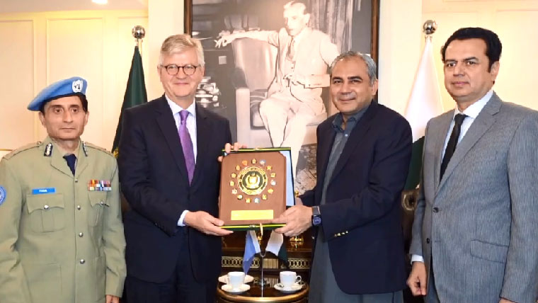وفاقی وزیر سے اقوامِ متحدہ کے انڈر سیکرٹری جنرل برائے امن مشنز جنرل جین پیر لاکروا کی ملاقات ہوئی، انہوں نے وزارت داخلہ آمد پر جنرل جین پیر لاکروا کا خیر مقدم کیا، وزیر مملکت داخلہ طلال چوہدری، سیکرٹری داخلہ محمد خرم آغا اور اقوام متحدہ کے سیکرٹری جنرل کے ایڈوائزر فیصل شاہکار بھی اس موقع پر موجود تھے۔ملاقات میں پاکستان اور اقوام متحدہ کے امن مشنز کے مابین تعاون بڑھانے پر تبادلہ خیال کیا گیا، اس موقع پر محسن نقوی نےکہا کہ پاکستان ہمیشہ اقوام متحدہ کے امن مشنز کا بھرپور حامی رہا ہے، عالمی امن کیلئے اپنا بھر پور کردار جاری رکھیں گے۔محسن نقوی کا کہنا تھا کہ پاکستانی فوج اور پولیس کے افسران نے کئی امن مشنز میں بھر پور مہارت سے کامیاب کردار ادا کیا ہے، کئی برس بعد پاکستانی پولیس افسران یواین میں دوبارہ فرائض سرانجام دینا شروع کر رہے ہیں، اس وقت پاکستانی افسران مختلف امن مشنز میں خدمات سرانجام دے رہے ہیں۔